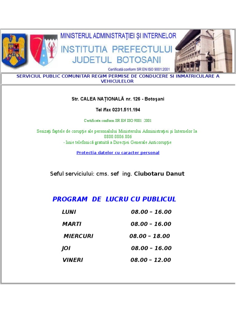 Fisa medicala permis auto si fisa psihologica necesara pentru obținerea sau preschimbare permisului auto, indiferent de categorie, in botosani. Serviciul regim permise și înmatriculări funcționează după un program stabilit pentru toate punctele din țară. rapiditate, personal medical mereu la dispozitia ta! Examinari preschimbare permis auto grupa ii (profesionisti). Astfel, luni, marți și miercuri de la ora 8.00 la 16.30, miercuri de la 8.00 la 18.30 și vineri de la 8.00 la 14.00, cu pauză între 12.00 și 12.20.