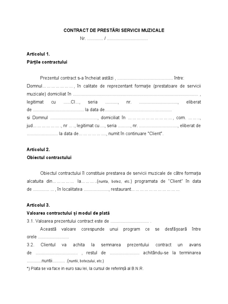 vizitati articolul complet aici : https://www.scribd.com/document/82938544/Contract-Muzica Acest contract de prestari servicii se încheie pe o durata de _ începând de la data autentificarii prezentului act adica azi, _ si pâna la data termenele intermediare ale prestarii serviciilor descrise mai sus sunt urmatoarele (n.b. Nu exista reglementari proprii in special acestui contract, el respectand prevederile privind contractele bilaterale cu titlu oneros si. Mai nr cluj napoca cui 15190728 0264 439 270 nr.
